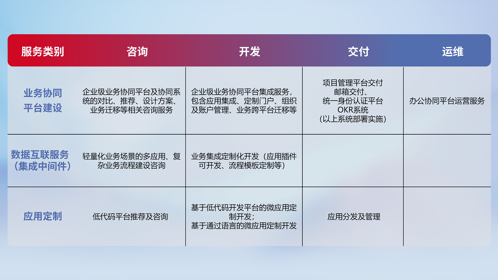 针对钉钉、、、企微、、、、IDaas等平台级产品提供产品的规划、、、方案、、、、交付、、、定制化开发等服务,,,实现如统一协同办公、、、、智能客户服务、、、、混合会议管理、、、、智能数据查询、、、等业务场景,,实现数字化转型。。。